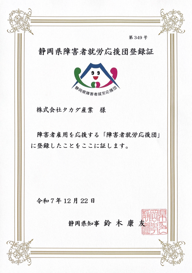 株式会社タカダ産業では、 静岡県が推進している障害者の就労支援の一環として、障害者が生き生きと社会生活を送ることができるよう積極的に障害者雇用に力を入れ、社会で活躍できる人材として「障害者就労応援団」として登録をしました。