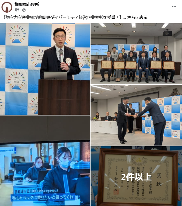 このたび、タカダ産業が受賞した 「令和7年度 静岡県ダイバーシティ経営企業」表彰式 の様子が、 御殿場市役所の公式Facebookにて紹介されました。