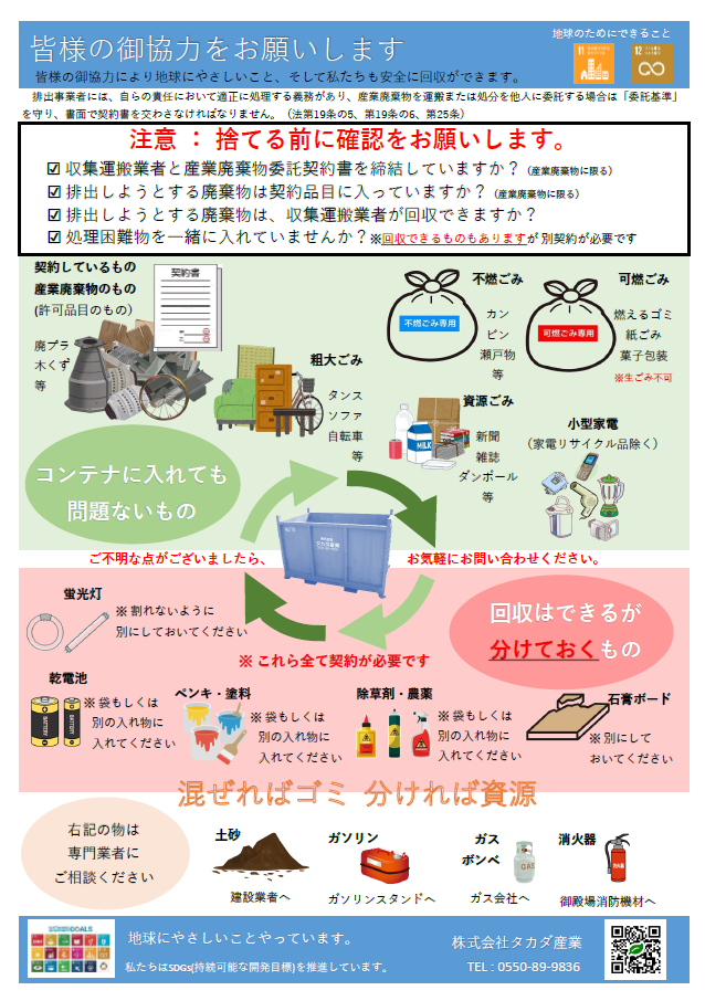 タカダ産業では、回収できるものと出来ないものを明確にし、不適正処理の防止を進めています。